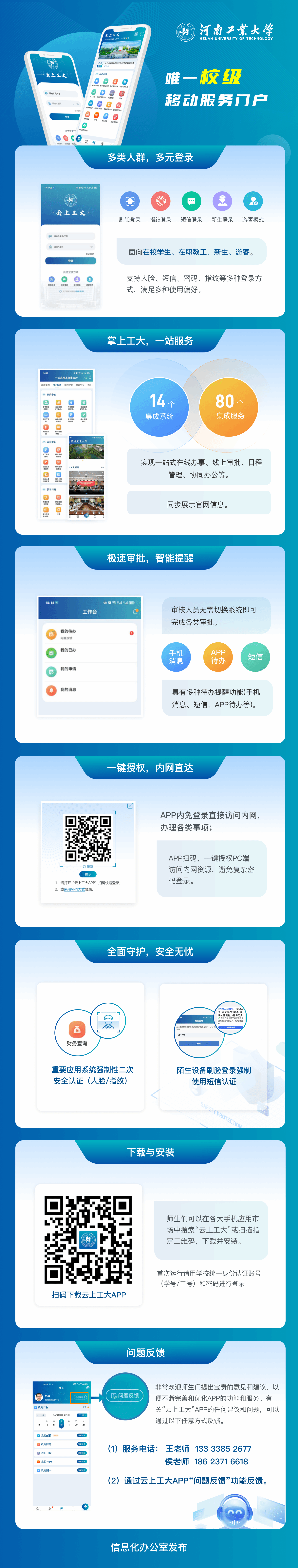 作為全校唯一的移動服務(wù)門戶,“云上工大”APP面向在校師生、新生、校友、游客等用戶,集成多個應(yīng)用系統(tǒng)和各類服務(wù)事項,包括查詢、繳費、預(yù)約、辦公、辦事申請等,實現(xiàn)一站式在線辦事、線上審批、日程管理、協(xié)同辦公等,將為大家提供更為便捷、高效的移動服務(wù)體驗。