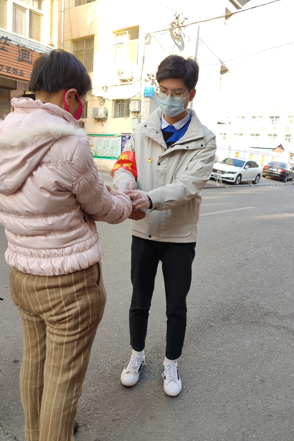 由于第三天下午封閉路口被用彩鋼板徹底封堵,從第四天開始,我來到了社區的一個可通行路口的體溫監測點,這個路口由于是為數不多的可以進入社區的道路之一,所以通行量比較大,我的服務內容也就變更成為了為過往的人群測量體溫,在來來往往形形色色的行人中,或許下一個人就會是新冠肺炎患者的密切接觸者,但是我們沒有退縮,在積極做好防護措施的同時為每一位行人進行精準的體溫測量和車輛的來往登記。由于氣溫較低,我們所使用的紅外體溫計除了一用一消毒之外,還要在體溫計暫時不用的情況下用手捂熱體溫計,不然測量的過程中就會出現較大的誤差。這里的條件比較艱苦,氣溫比較低,我們只能用取暖器取暖,沒有吃飯的地方,只能自己燒水吃泡面。在我志愿服務的第六天,團縣委為我們青年志愿者統配發了共青團團徽,要求我們在志愿服務時佩戴在身上,當我佩戴上團徽的時候,我更加意識到了共青團員發揚社會主義新風尚,積極參加志愿服務,實踐社會主義核心價值觀和社會主義榮辱觀的這一義務,由于個人的原因,我在第一學期并沒有參加入黨積極分子的評選,而下次我會積極參與,爭取能成為一名光榮的共產黨員。