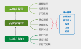按照單元教學目標的高低階層次,將對應的教學內容分為基礎模塊和高階模塊。基礎模塊內容安排在課前學習,以微課為主。高階模塊內容服務于高階思維及綜合能力培養,在課中進行,通過案例分析、討論等互動學習促使學生深度思考、完成知識內化。課后增加學科知識及能力拓展內容,以小組互助學習為主。