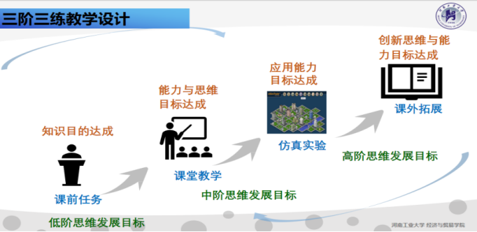 2.教學理念和教學目標有新的發展。我們秉承的教學理念是以學為中心,以成果導向為目標,通過學習,養成學生善于思考質疑,培養健全人格。以戴爾的經驗之塔為基礎,充分發揮團隊合作精神,讓學生互教互學;以布魯姆的教育目標為核心,設計了三階三練混合式教學。