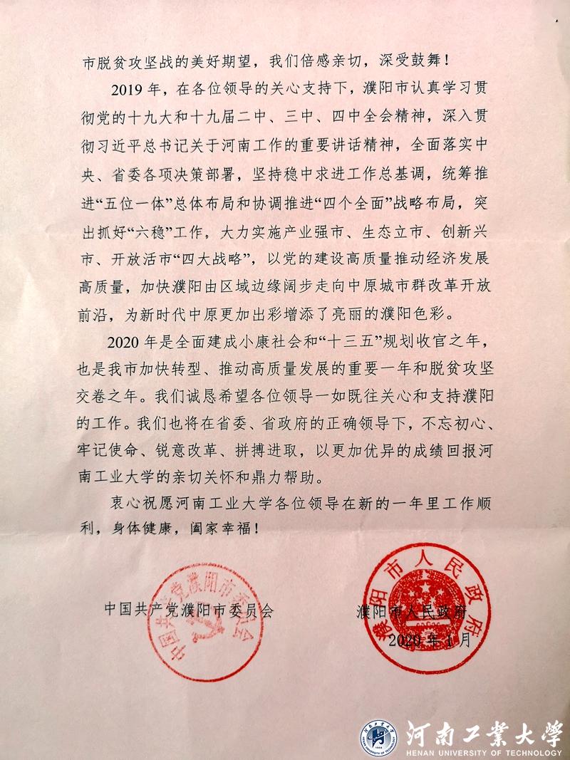 濮陽市委、市政府在信中還誠懇希望校黨委及各位領導一如既往地關心和支持濮陽工作,并為校黨委和各位領導送上誠摯祝福。