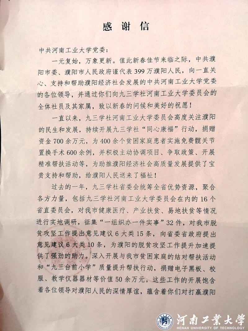 信中指出,一直以來,九三學社河南工業大學委員會在學校黨委的支持下,在九三河南省委的領導下,高度關注濮陽的民生和發展,積極參加九三學社“同心康福”行動,主動協調項目、爭取政策、開展精準幫扶活動;對濮陽市健康醫療、產業扶貧、易地扶貧等情況進行實地調研,積極建言獻策;深入開展與濮陽市貧困家庭的結對幫扶活動和“九三臺前小學”質量提升幫扶行動等。為助推濮陽經濟社會高質量發展提供了堅強支持和幫助,為濮陽的脫貧攻堅工作提升加速提供了強勁的助力,給濮陽人民送去了福祉。這些工作的開展飽含著校黨委和各位領導對濮陽人民的深情厚誼,蘊含著校黨委和各位領導對打贏濮陽市脫貧攻堅戰的美好期望。