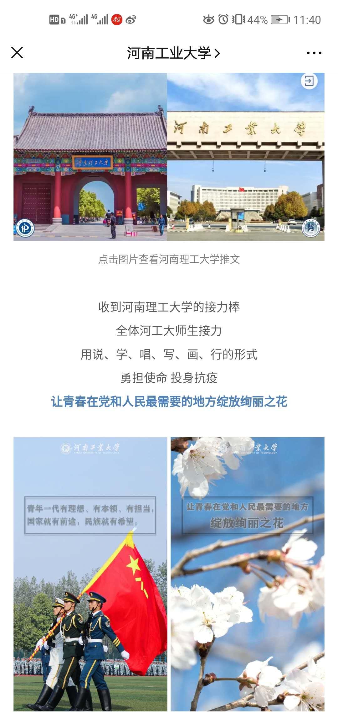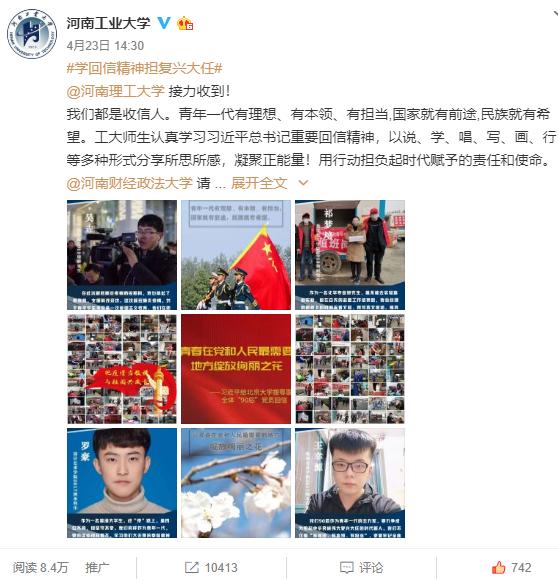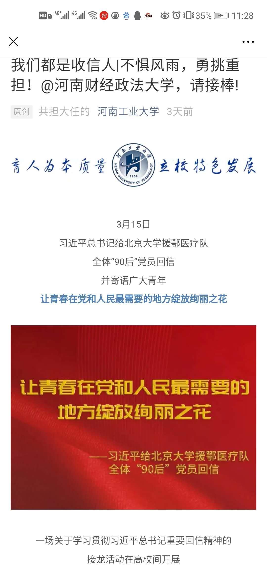 自線上接力開展以來,學校微信推文《我們都是收信人|不懼風雨,勇挑重擔!@河南財經政法大學,請接棒!》閱讀量已突破5萬,學校#學回信精神擔復興大任#接龍微博閱讀量突破8萬。根據工作安排,下一步學校還將結合學習回信精神,在校內繼續開展“把災難當教材 與祖國共成長”學院官微“@大接龍”活動,保證疫情防控期間,對學校師生的思想引領不缺席,引導廣大師生將回信精神落實到為人民服務的工作和學習中去,讓青春在黨和人民最需要的地方綻放絢麗之花。