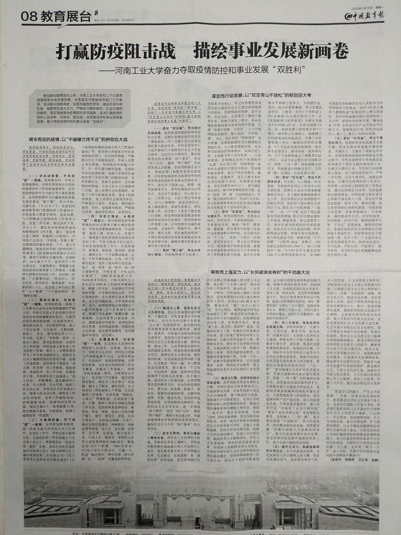 中國教育報5月18日第8版“教育展臺”欄目,以“打贏防疫阻擊戰 描繪事業發展新畫卷——河南工業大學奮力奪取疫情防控和事業發展‘雙勝利’”為題報道我校疫情防控和教育事業發展工作開展情況。