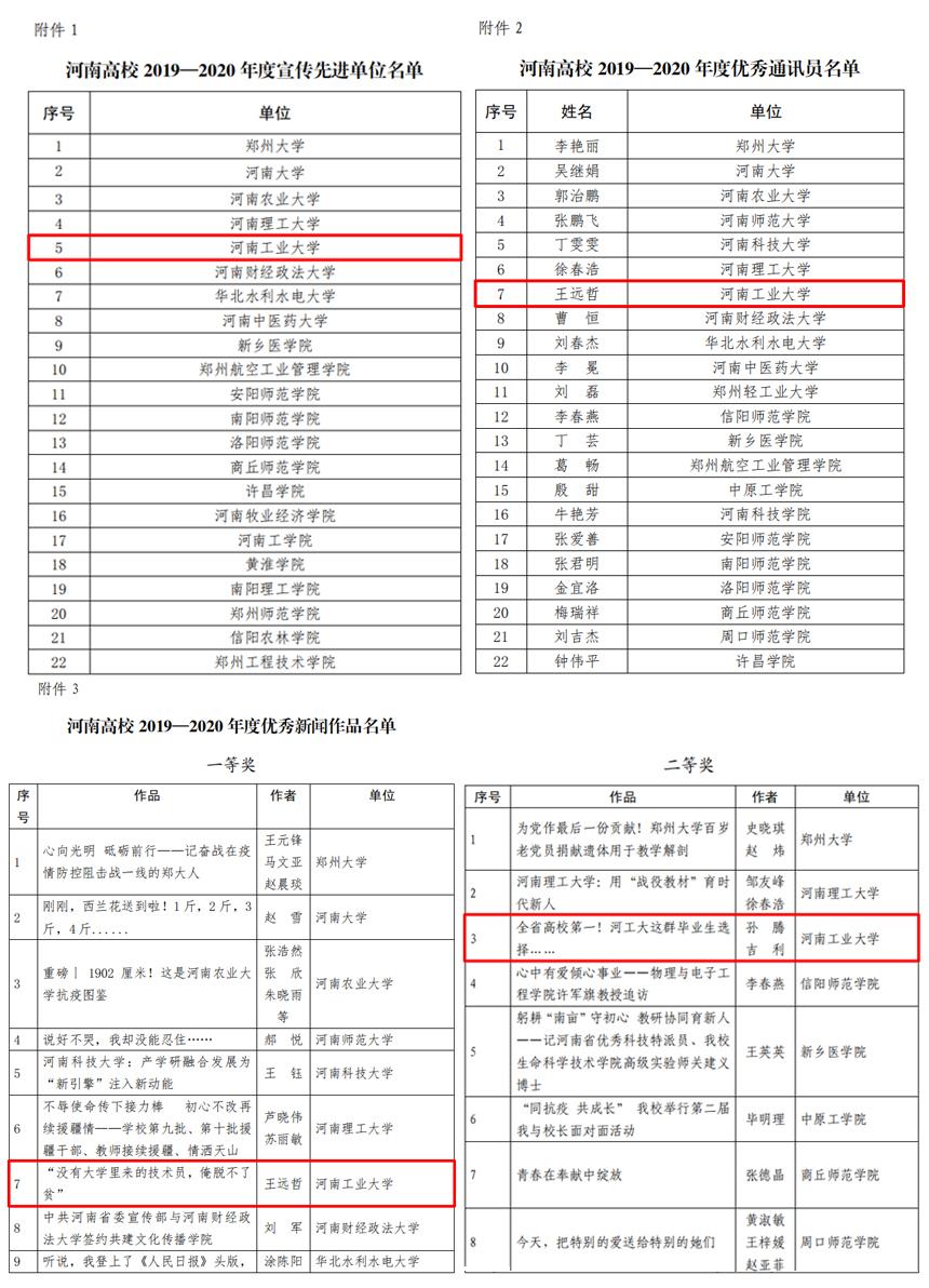 本次活動經過學校申報推薦、專家組集中評審等層層選拔,最終評選出河南高校2019-2020年度宣傳先進單位30個、優秀通訊員60名、優秀新聞作品95篇,其中一等獎25篇、二等獎30篇、三等獎40篇。我校榮獲河南高校2019—2020年度宣傳先進單位,王遠哲老師被評為河南高校2019—2020年度優秀通訊員,王遠哲老師的作品《沒有大學里來的技術員,俺脫不了貧》榮獲河南高校2019—2020年度優秀新聞作品獎一等獎,孫騰、吉利老師的作品《全省高校第一!河工大這群畢業生選擇......》榮獲河南高校2019—2020年度優秀新聞作品二等獎。