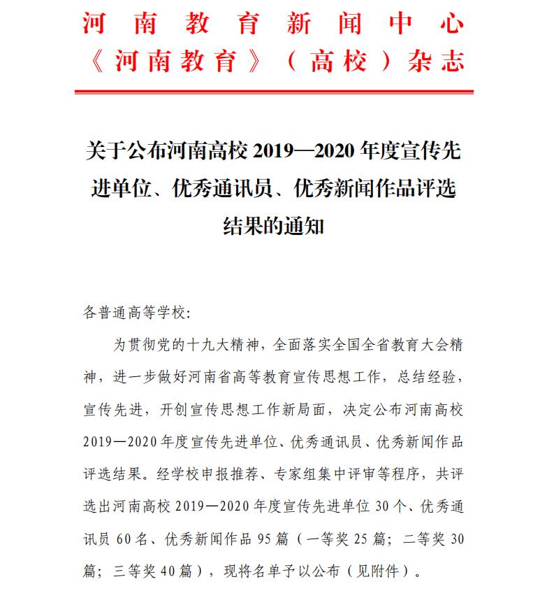 近日,由河南教育新聞中心、《河南教育》(高校)雜志共同發起的河南高校2019—2020年度宣傳先進單位、優秀通訊員、優秀新聞作品評選活動結果揭曉,我校獲得多項榮譽。