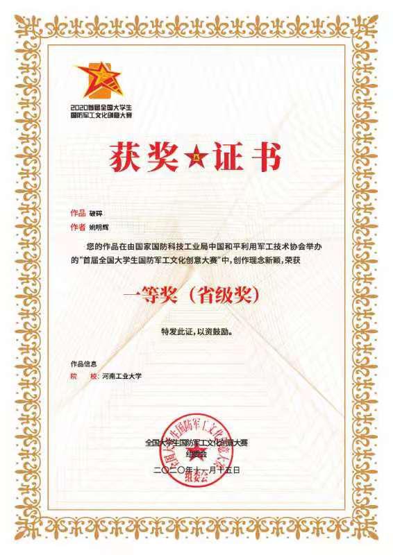近日,2020首屆全國大學生國防軍工文化創意大賽結果揭曉,漯河工學院視覺傳達與設計專業姚明輝同學的作品《黑夜炫彩》、張警輝同學的作品《包裝設計》雙雙榮獲全國二等獎,姚明輝同學的另一幅參賽作品《破碎》榮獲全省一等獎。