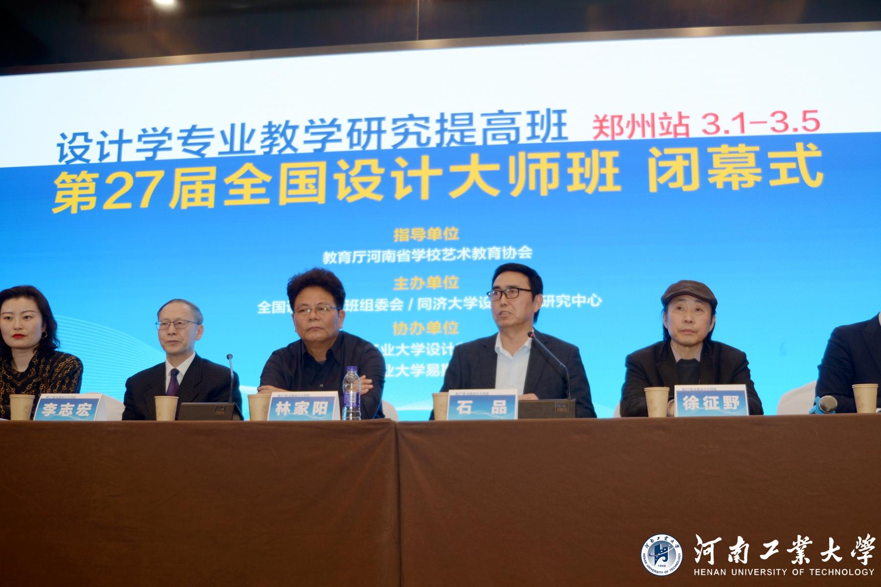 第27屆全國設(shè)計(jì)大師班閉幕式于3月5日下午舉行。林家陽教授,石品教授,徐征野老師,李志宏老師,河南工業(yè)大學(xué)教務(wù)處副處長車愔、盧娜等參加閉幕式。參會(huì)嘉賓和教師代表分別就五天的課程分享了心得體會(huì)。