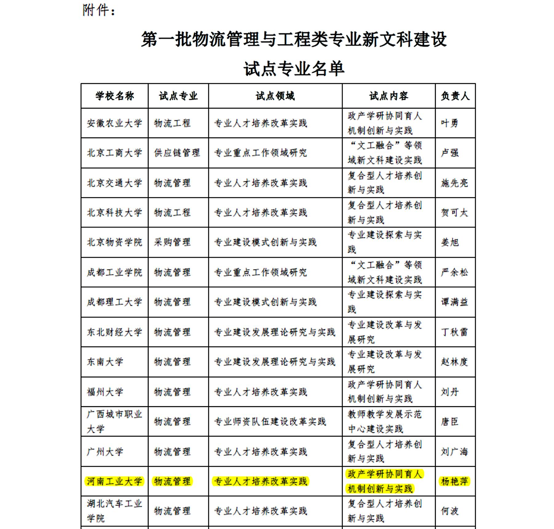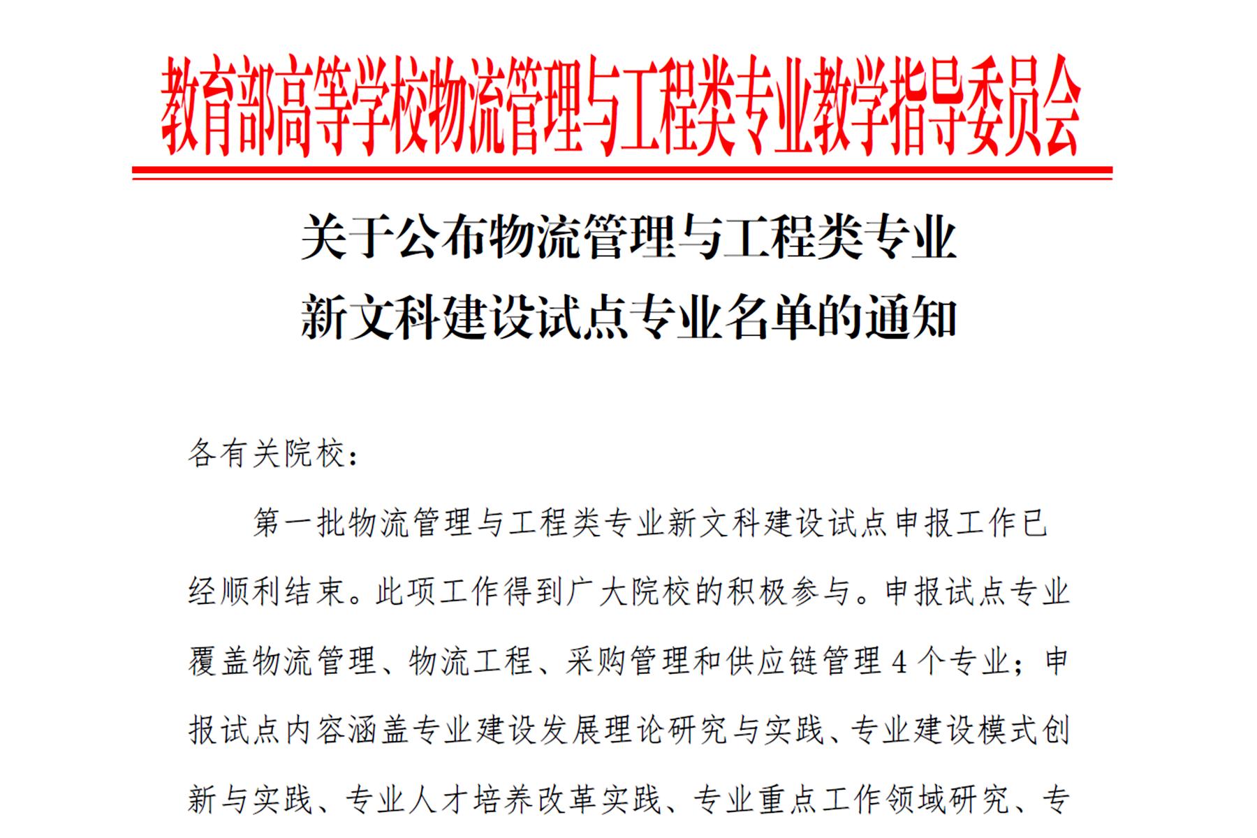 近日,教育部高等學校物流管理與工程類專業教學指導委員會公布第一批物流管理與工程類專業新文科建設試點專業名單,河南工業大學管理學院物流管理專業成功入選(河南省唯一入選高校),這是該專業繼2019年成功獲批國家級一流本科專業建設點后的又一重大突破。