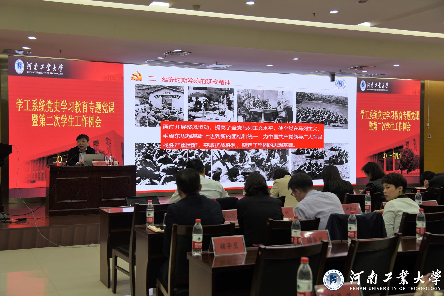 為進一步推動黨史學習教育深入開展,傳承紅色基因,堅定理想信念,4月29日,學工系統黨史學習教育專題黨課暨第二次學生工作例會在學術報告中心D205報告廳舉行,校黨委書記張元以《延安精神垂青史,實事求是拓新程》為題講授專題黨課。學生工作領導小組成員單位相關負責同志,各學院黨委副書記及全體輔導員,學工部、就業創業中心、校團委全體工作人員,青馬星火團、國防預備役學生參加了此次黨課學習。會議由學工部部長黃澤峰主持。