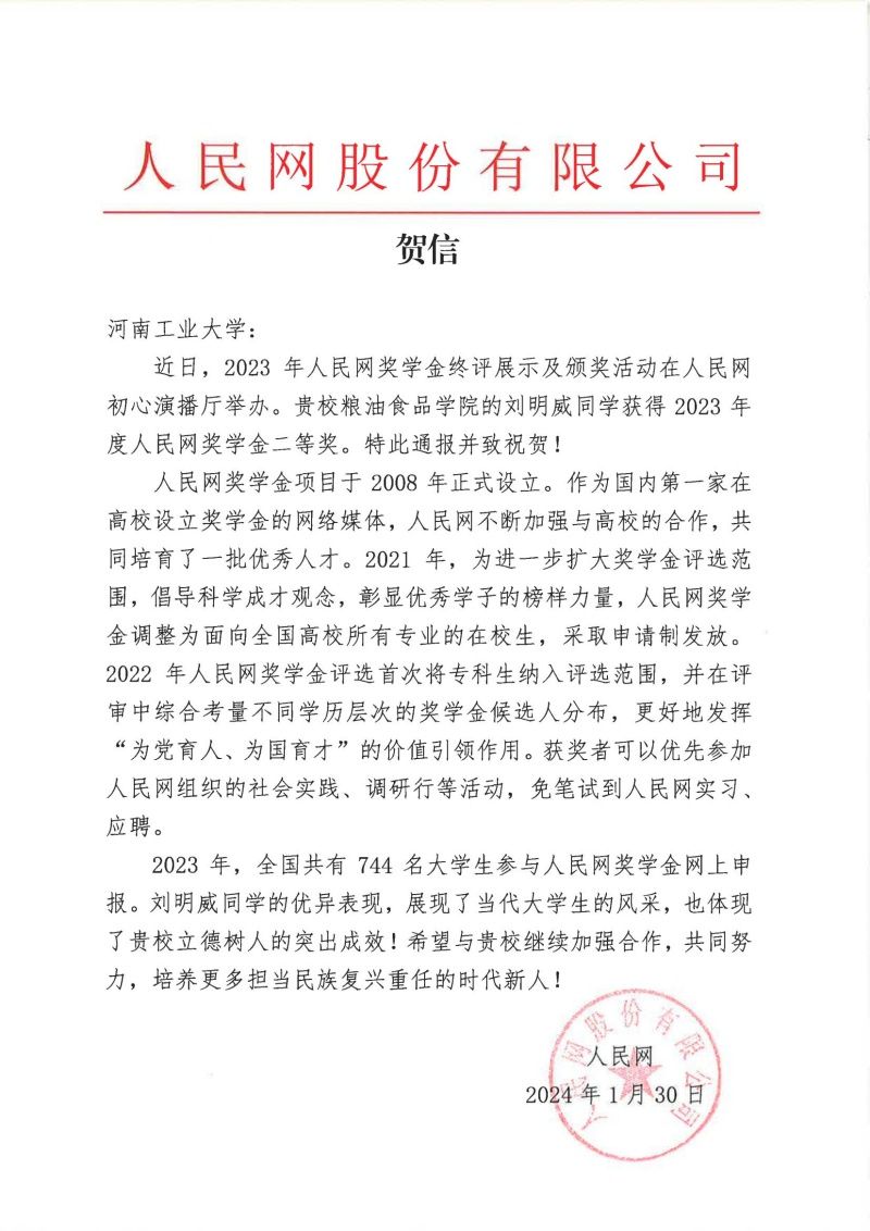 近日,2023年人民網獎學金終評展示及頒獎典禮在北京成功舉辦,我校糧油食品學院本科生劉明威榮獲人民網獎學金二等獎,為河南省2023年唯一獲獎者。