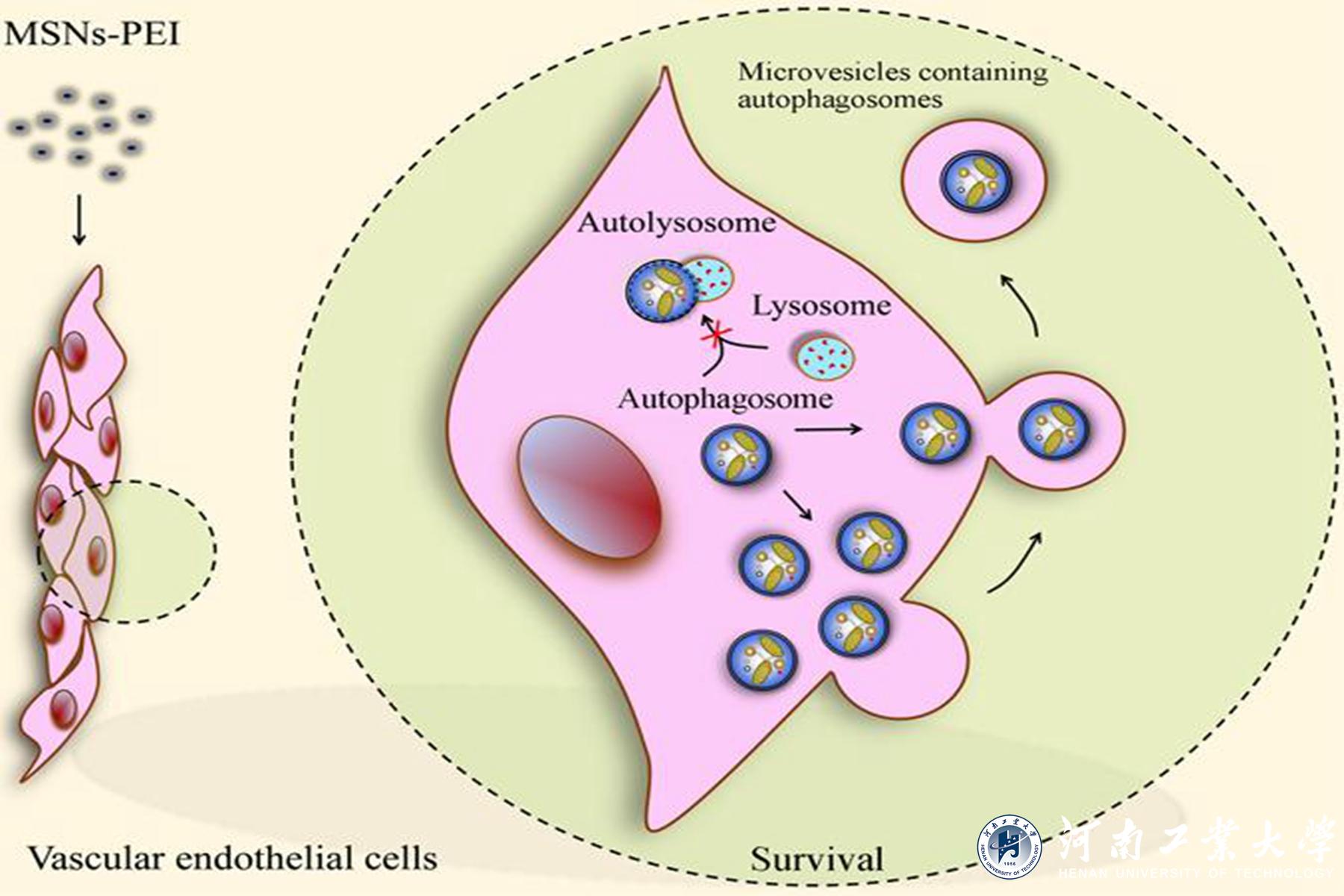 與未修飾的MSNs、氨基修飾的MSNs或脂質體包裹的MSNs不同,100 μg/ml聚乙烯亞胺修飾的MSNs(MSNs-PEI)對人臍靜脈內皮細胞無明顯毒性。然而,MSNs-PEI阻斷自噬小體與溶酶體的融合,誘導自噬小體積聚,這是許多納米顆粒毒性的核心機制。據此,研究者預測在血管內皮細胞中存在一種自噬小體清除的替代途徑來減輕MSNs-PEI誘導的自噬應激。進一步研究發現,MSNs-PEI誘導細胞骨架結構改變,但不引起內質網應激,當MSNs-PEI阻斷自噬小體降解時,積累的自噬小體通過微泡釋放到細胞外空間。阻斷自噬小體的形成或釋放會導致受損線粒體堆積和活性氧的過量產生,進而導致血管內皮細胞死亡。該研究在國際上首次證實當納米顆粒阻斷了自噬小體降解時,細胞產生一種緩解自噬壓力的補償機制,即通過微體介導自噬小體釋放到胞外,維持血管內皮細胞穩態。因此,促進積累自噬小體的釋放可能是對抗納米顆粒血管毒性的一種新的保護策略。