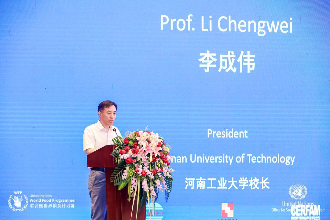 李成偉代表河南工業大學在大會開幕式上致辭。他向參會代表介紹了學校“因糧而立、為糧而育、依糧而為、緣糧而興”的歷史沿革、辦學定位、發展理念和發展概況。他指出,聯合國世界糧食計劃署在成立和發展的60年里,始終致力于幫助發展中國家改善糧食自給制度,消滅饑餓與貧困,為實現在世界范圍內終結饑餓,實現糧食安全,改善營養狀況做出了卓越的貢獻。河南工業大學作為以糧食為特色發展的高等院校,建校以來始終不忘初心,牢記使命,矢志不渝地致力于糧食行業的人才培養、科學研究和社會服務工作,先后為全國乃至世界糧食行業的發展進步培養了20多萬名優秀畢業生。近5年來,學校通過科技創新及成果轉化,不斷提高稻谷精深加工水平,創建了涵蓋有害生物檢測和預警、綠色智能防控、優質稻收儲保質降耗、污染物數據庫構建的中國農戶稻谷儲藏體系,使稻收儲藏損失率減少5%以上、稻谷損失損耗率和單位能耗率均降低約2%左右,提升大米出品率約3.5%、降低大米碎米率7.5%以上、能耗降低15%以上;“油脂熱加工過程典型危害物的脫除及控制研究”等相關技術成果在中糧、益海嘉里、中儲糧、五得利集團等國內外350多家大型糧油企業進行示范應用推廣,為國家和世界全面增強稻谷儲備能力、延長稻谷加工產業鏈、豐富人民群眾飲食文化生活做出了高校應有的貢獻。同時,學校作為河南省對外援助培訓中心,還積極服務于世界糧食行業人才隊伍建設和知識更新工作,先后為49個非洲國家舉辦各類糧農類培訓班50期,累計培訓各類糧食官員、糧農技術人員800多人。