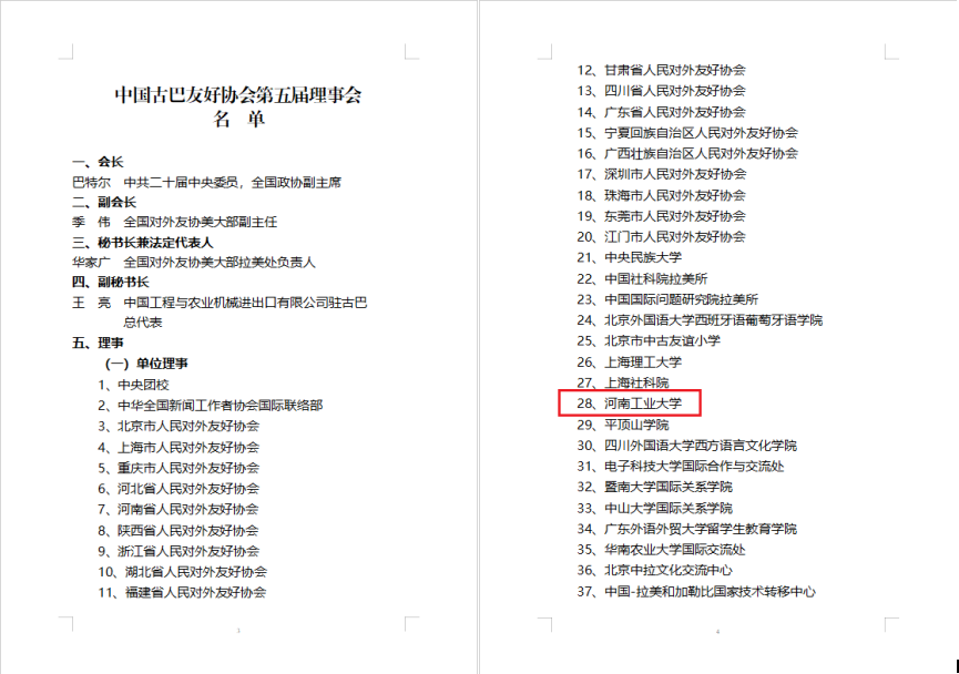 河南與古巴一直以來具有良好的交往歷史與合作基礎,2009年7月,河南省與古巴哈瓦那市締結友好省市,自此開啟了雙方在文化、教育、衛生領域的廣泛合作。此次,經省對外友協推薦,我校成功入選協會第五屆單位理事名單,是中國古巴友好協會和社會各界對我校辦學成果和辦學影響力的高度認可。后續,學校將充分利用該雙邊平臺、持續推動我省與古巴友好交流、深度融入中古命運共同體建設。