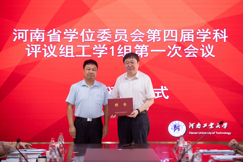 河南省教育廳學位管理與研究生教育處副處長周朝霞代表省教育廳宣布我省第四屆學科評議組工學1組召集人為河南工業大學張元教授,并為其頒發聘書;張元教授依次為副召集人、秘書長和其他學科評議組成員頒發聘書并合影留念。