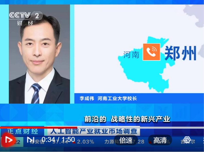 2021年8月10日16:00,CCTV-2央視財(cái)經(jīng)頻道【正點(diǎn)財(cái)經(jīng)】欄目播出了對(duì)河南工業(yè)大學(xué)校長(zhǎng)李成偉就“破解人工智能技術(shù)落地難,人才培養(yǎng)模式亟待更新”問題,學(xué)校產(chǎn)教融合、協(xié)同育人的開展情況接受了央視財(cái)經(jīng)頻道電話專訪的部分內(nèi)容。