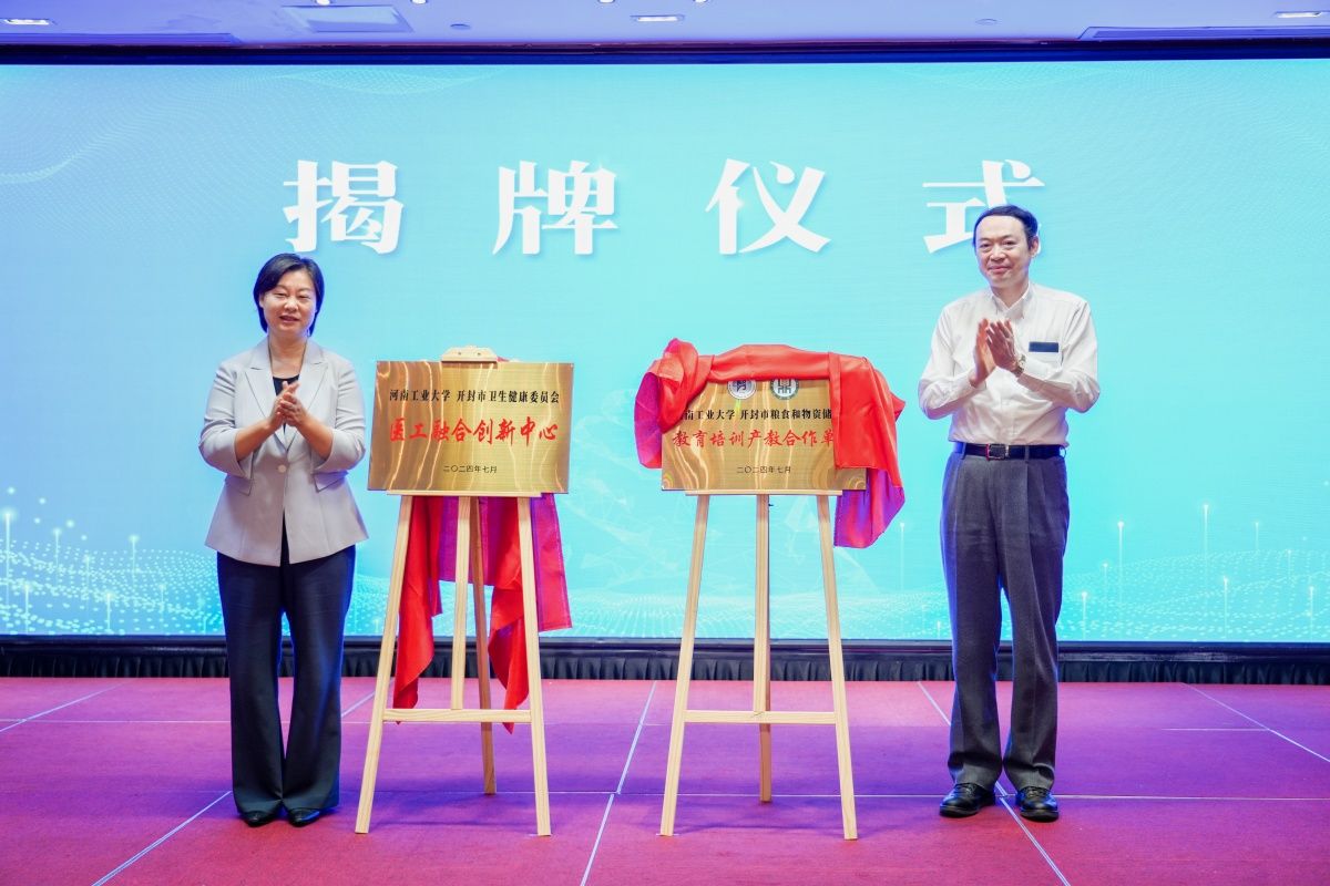 吳智深、吳海燕為“醫(yī)工融合創(chuàng)新中心”和“河南工業(yè)大學(xué)教育培訓(xùn)產(chǎn)教合作單位”揭牌