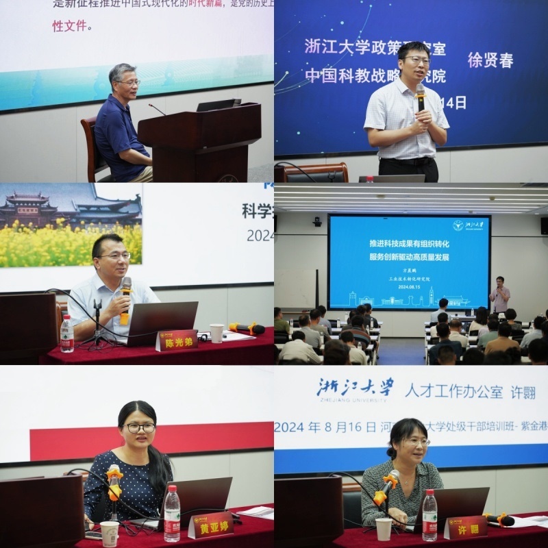 培訓期間,浙江外國語學院黨委書記宣勇以《黨的創(chuàng)新理論推動向一流高水平大學轉型發(fā)展的思考與實踐》為題,浙江大學政策研究室主任兼黨辦校辦副主任、中國科教戰(zhàn)略研究院副院長徐賢春以《一流學科群建設探索與發(fā)展規(guī)劃》為題,浙江大學基礎交叉研究院副院長陳光弟以《高校科研發(fā)展研究與創(chuàng)新實踐》為題,浙江大學工業(yè)技術轉化研究院產學研合作部副主任兼成果轉化項目服務部主任方晨鵬以《推進科技成果有組織轉化服務創(chuàng)新驅動高質量發(fā)展》為題,浙江大學校長辦公室副主任、教育學院百人計劃研究員黃亞婷以《高校教育評價機制與改革路徑探索》為題,浙江大學人才工作辦公室主任、人力資源處副處長(兼)、黨委組織部副部長(兼)許翾以《教育強國建設背景下的人才引進與人才管理體系建設》為題進行6場專題講座。培訓同時組織全體學員赴浙江諸暨楓橋鎮(zhèn)重溫“楓橋經驗”起源和發(fā)展,進一步體悟習近平總書記重要指示批示精神;赴嘉興南湖革命紀念館進行現(xiàn)場教學,重溫入黨誓詞,感悟紅船精神,增強理想信念與黨性修養(yǎng);實地考察浙江大學紫金港科創(chuàng)小鎮(zhèn),解剖產教融合與校企合作實際案例,汲取校企雙融先進經驗;參觀學習浙江大學藝術與考古博物館,深切感受浙大文化、精神的傳承與創(chuàng)新。