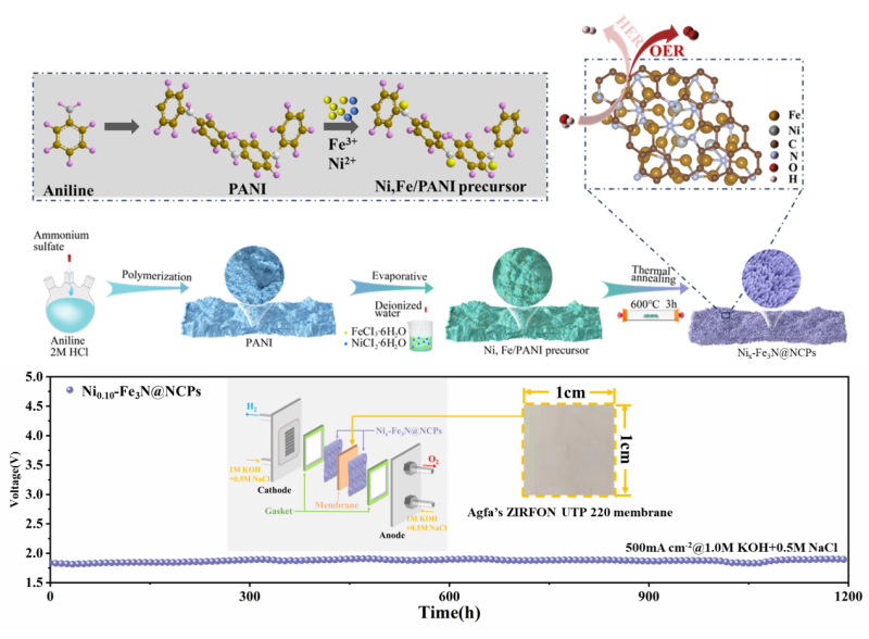 相對于淡水,地球海水資源更為豐富,因此電解海水被認為是最有前途的制氫方法。本研究首先利用苯胺和過硫酸銨合成了PANI聚合物,在負載過渡金屬后通過高溫退火合成了HER/OER雙功能電解海水催化劑Nix-Fe3N@NCPs。將Ni摻雜到Fe3N晶格中,兩者可以產生協同效應,改變Fe3N的電子構型,加速其內部的電子轉移。該催化劑中NPCs封裝納米層的存在不僅提高了導電性和結構穩定性,還有效抑制了海水中Cl-的傳輸和對電催化活性位點的毒害。在全解模擬海水測試中,僅需1.72V即可達到500 mA cm-2的大電流密度,并表現出優異的穩定性。另外,在零間隙堿性電解槽中,Ni0.10-Fe3N@NCPs電催化劑在1.80V的超低電壓下即可實現 500 mA cm?2的電流密度并具有1200h的超長使用壽命。本研究工作為電解海水電催化劑的研究提供了前沿性的探索。