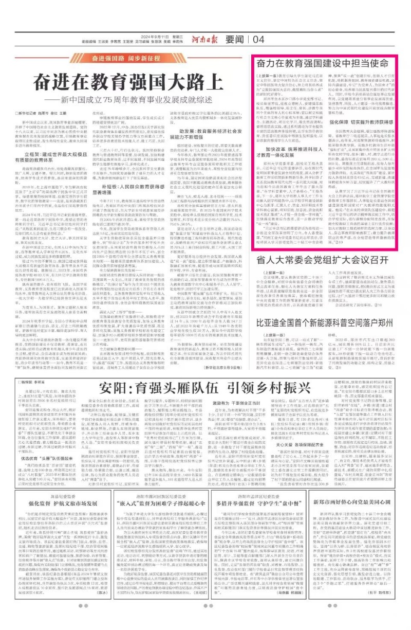 習近平總書記的講話精神在全省教育系統引發熱議,在我校師生中引起強烈反響。9月11日,《河南日報》對我校黨委書記劉志軍學習貫徹習近平總書記在全國教育大會上的重要講話精神心得體會進行了報道,相關內容被《河南日報》(2024年9月11日)頭版刊發,并被河南省教育廳全文轉載。