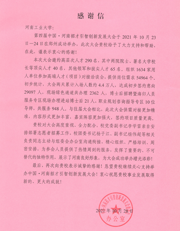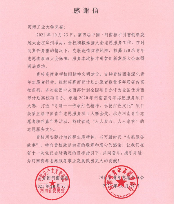 近日,我校圓滿完成“第四屆中國·河南招才引智創(chuàng)新發(fā)展大會(huì)”的志愿服務(wù)工作。大會(huì)組委會(huì)、河南團(tuán)省委、河南青年志愿者協(xié)會(huì)等部門致函我校,對200余青年志愿者的工作給予了高度評價(jià)。會(huì)議期間,李成偉校長、河南團(tuán)省委李麗書記等親切慰問了我校志愿者。志愿者事跡受到多家省級媒體報(bào)道。