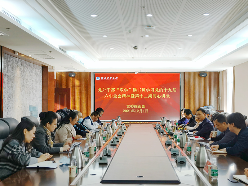 為深入學習宣傳貫徹黨的十九屆六中全會精神,進一步加強黨外知識分子思想政治引領。12月1日,黨委統戰部在辦公樓A515舉辦黨外干部“雙學”讀書班學習黨的十九屆六中全會精神暨第十二期同心講堂,邀請馬克思主義學院副院長、校理論宣講團成員李海濤副教授,作主題為《以史為鑒 開創未來——黨的十九屆六中全會精神解讀》的專題報告。黨外干部“雙學”讀書班成員、各民主黨派統戰團體代表參加會議。黨委統戰部副部長晏玉珍主持會議。
