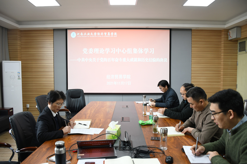11月17日,經濟貿易學院在3503會議室召開黨委理論學習中心組學習會,專題學習十九屆六中全會精神。學院黨委理論學習中心組成員參加學習。