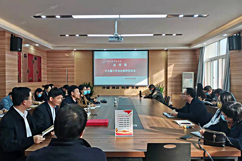 12月7日,法學院召開黨的十九屆六中全會精神宣講會,邀請校黨委宣講團成員趙鵬博士作宣講報告,學院全體教職工參加,黨委書記陳從志主持。