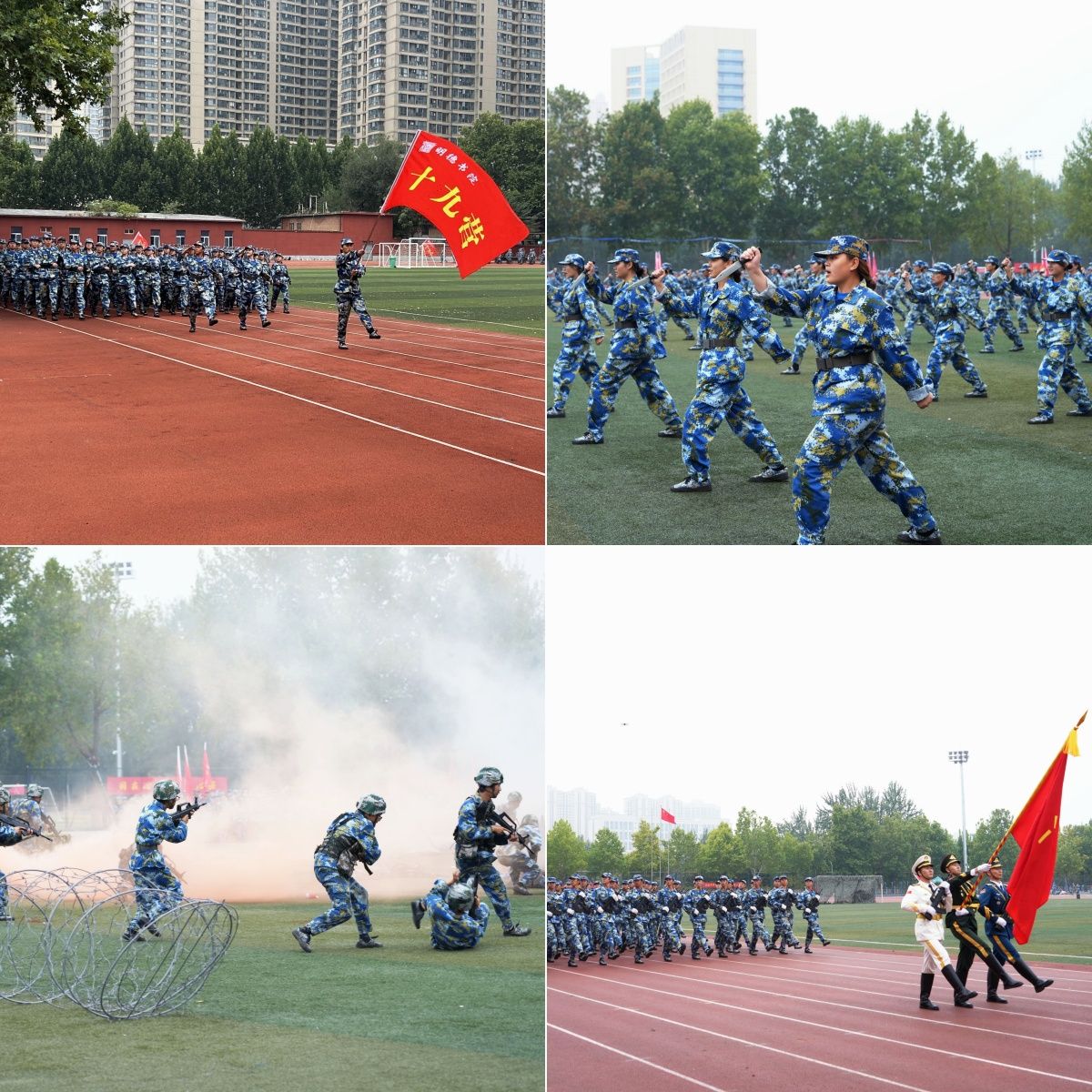 大會伊始,校黨委書記劉志軍和校長吳智深分別在嵩山路校區和蓮花街校區宣布軍訓表彰大會開始。近9000名新生身著迷彩戎裝,軍容嚴整、斗志昂揚、英姿颯爽,帶來了軍體拳、擒敵拳、匕首操、應急棍術等精彩表演,展現了大學生朝氣蓬勃、自信自強、堅韌不拔、昂揚向上的良好形象。軍體拳表演剛勁有力、干凈利落、動作精練、熱血激揚,彰顯剛毅不屈的英雄氣概。戰術表演編排精彩、跌宕起伏,迫擊炮射擊、人質營救等模擬戰場,狼煙滾滾,讓人仿佛身臨其境,一攻一防盡顯血性膽氣。女生組成的匕首操方陣,動作行云流水,氣勢磅礴震撼,一招一式打出巾幗不讓須眉的豪氣。分列式上,各學院方陣列隊整齊、步伐堅定、身姿挺拔、神情堅毅、口號嘹亮,依次通過主席臺接受檢閱,展現了我校學子青春洋溢、蓬勃向上的精神風貌,贏得了在場師生的陣陣掌聲。