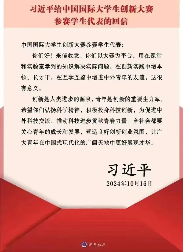 近日,中共中央總書記、國家主席、中央軍委主席習(xí)近平給中國國際大學(xué)生創(chuàng)新大賽參賽學(xué)生代表回信,對他們予以親切勉勵并提出殷切希望。