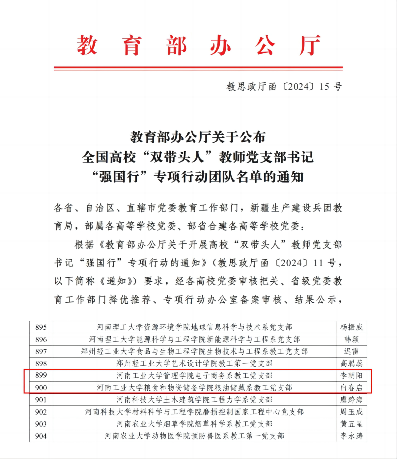 近日,教育部發布了《關于公布全國高校“雙帶頭人”教師黨支部書記“強國行”專項行動團隊名單的通知》,我校管理學院電子商務系教工黨支部、糧食和物資儲備學院糧油儲藏系教工黨支部等2個黨支部,入選全國高校“雙帶頭人”教師黨支部書記“強國行”專項行動團隊,這是繼入選第三批“全國黨建工作樣板支部”培育創建單位后,在黨建工作方面的又一重要突破。