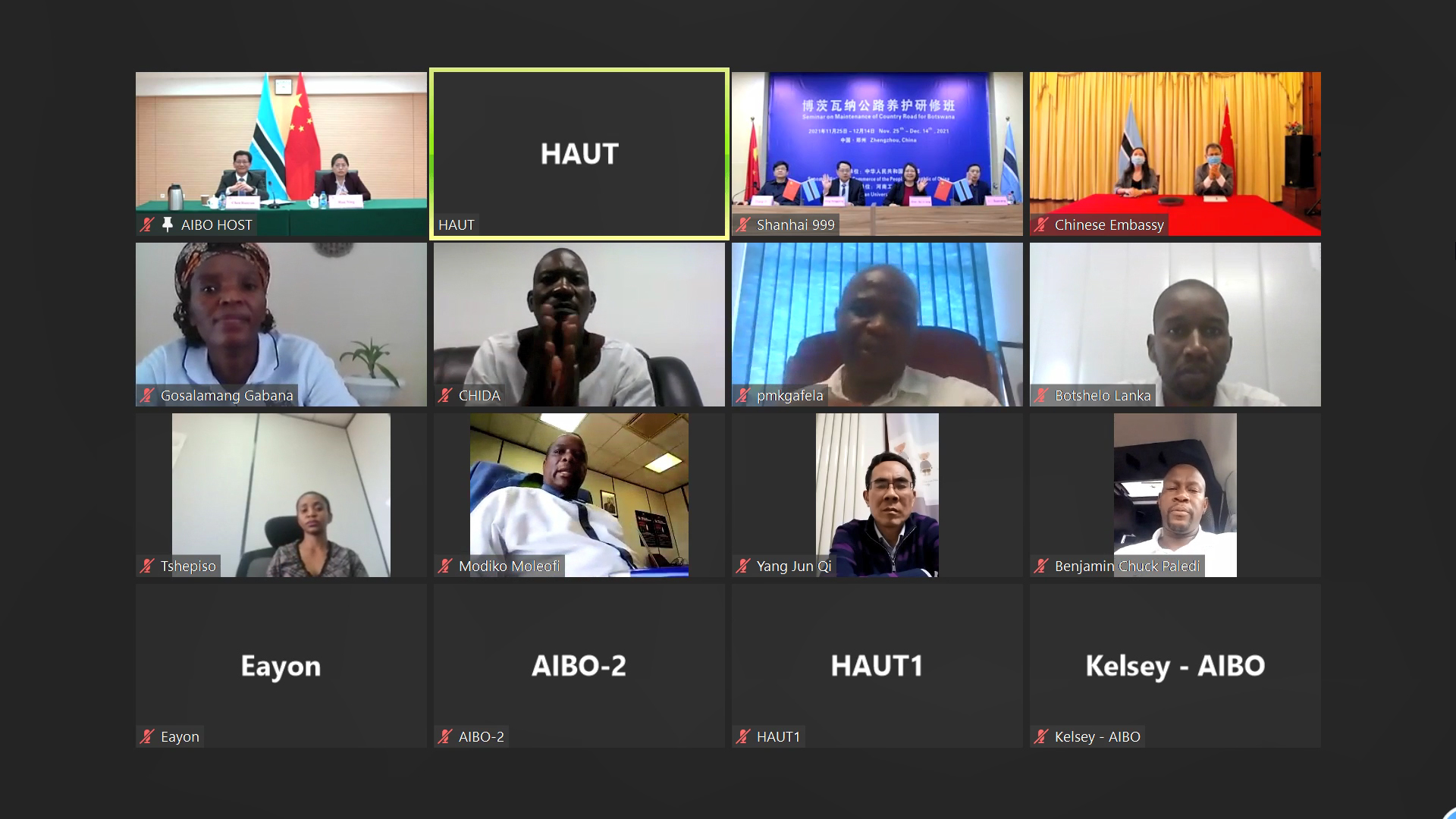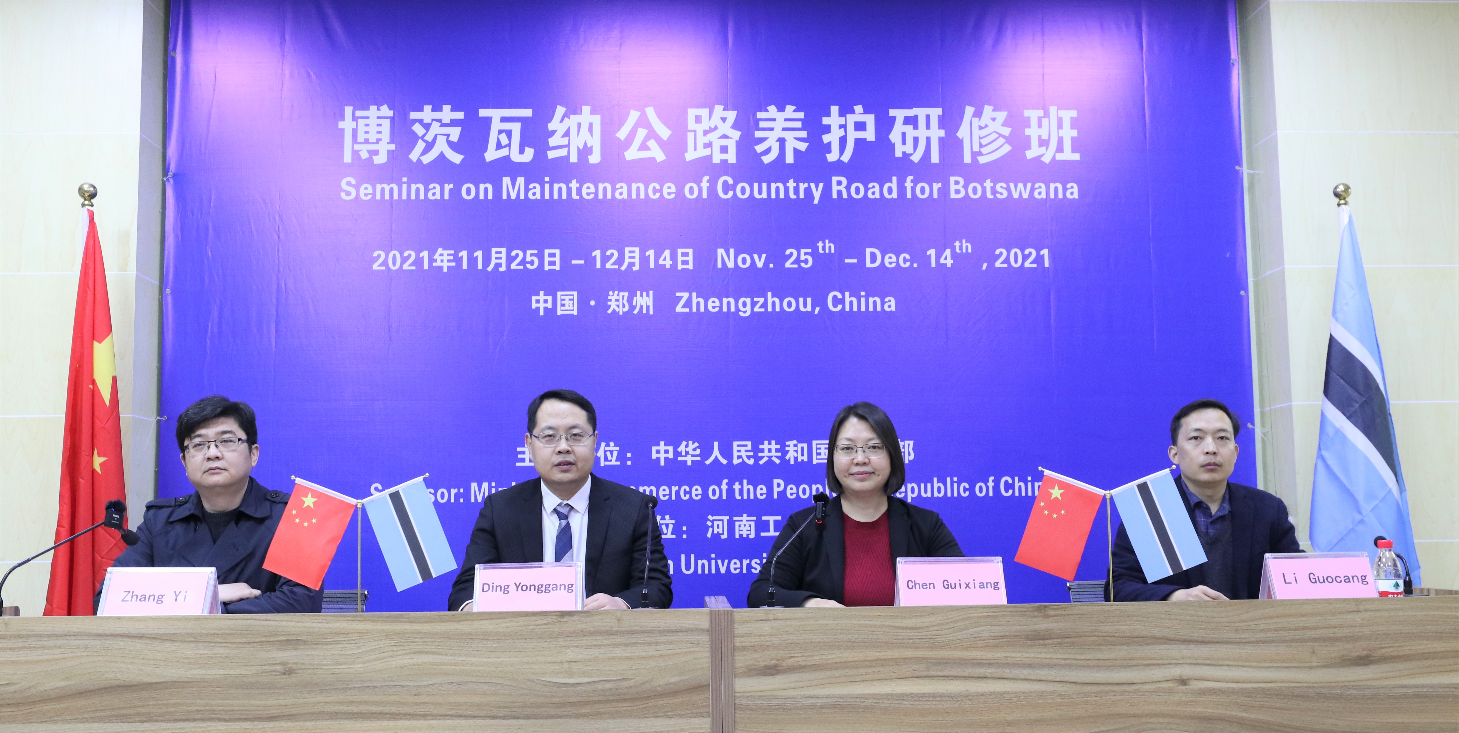 12月14日,由中華人民共和國商務部主辦,河南工業(yè)大學承辦的司處級“博茨瓦納公路養(yǎng)護研修班”順利結班,結業(yè)典禮通過線上形式在中國北京、河南鄭州和博茨瓦納首都哈博羅內三地同時進行。中國駐博茨瓦納大使館經(jīng)濟商務處參贊楊迅雷、商務部國際官員研修學院副院長陳潤云、河南省商務廳外經(jīng)處副處長楊軍岐、商務部國際官員研修學院項目管理處副處長韓寧,河南工業(yè)大學副校長陳桂香、土木工程學院院長丁永剛、遠程與繼續(xù)教育學院副院長李國倉以及博茨瓦納交通與信息部各司處級官員共同出席了結業(yè)典禮。