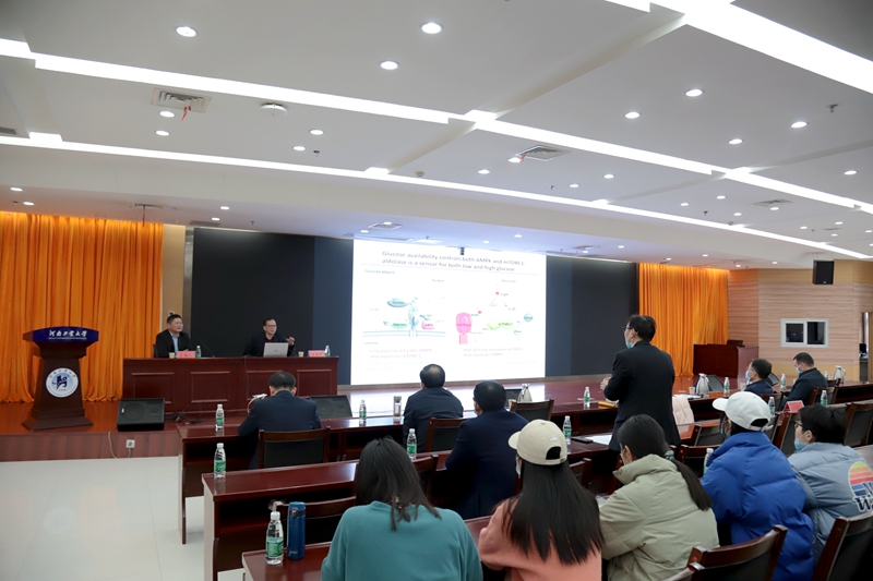 隨后,林院士在學術報告中心D205會議室做了題為《葡萄糖的感知及二甲雙胍作用機制》的學術報告,并與我校師生進行了熱烈深入地交流。林院士淵博的專業學識、敏銳的科研思維、嚴謹的學術態度給大家留下了深刻印象,激發了對學科前沿研究的濃厚興趣,讓廣大師生受益匪淺。