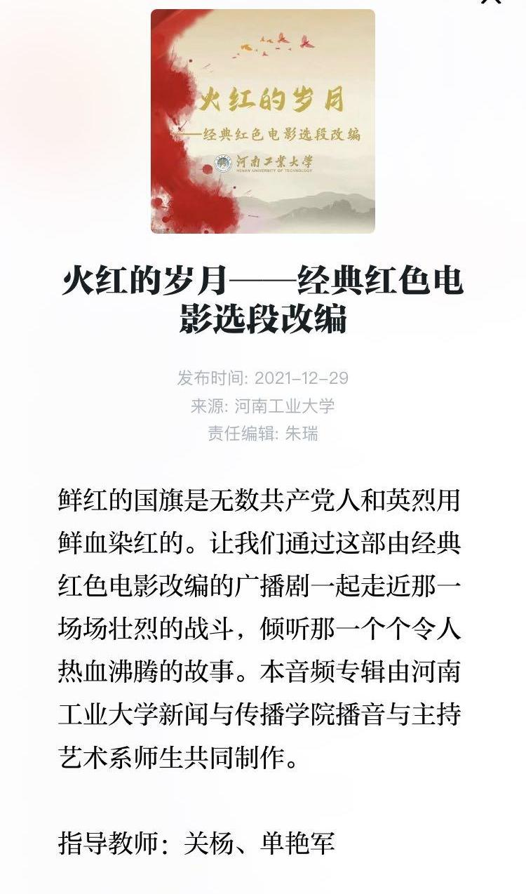 我校新聞與傳播學院關楊和單艷軍老師指導的《廣播節目播音主持》課程結課作品《廣播劇:火紅的歲月》于2021年12月29日在中宣部“學習強國”學習平臺強國之聲頻道大學生朗讀欄目上線。