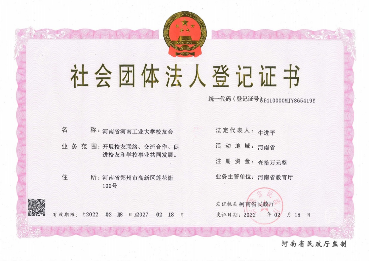 近日,在我校各項事業奮力邁進之際,在廣大校友的熱切期盼中,河南省民政廳下發了“河南省民政廳準予行政許可決定書”【豫民社準字(2022)13號】文件,并頒發了“社會團體法人登記證書”。至此,我校校友會成為由省教育廳批準、省民政廳注冊登記、具有法人資格的合法社團組織。
