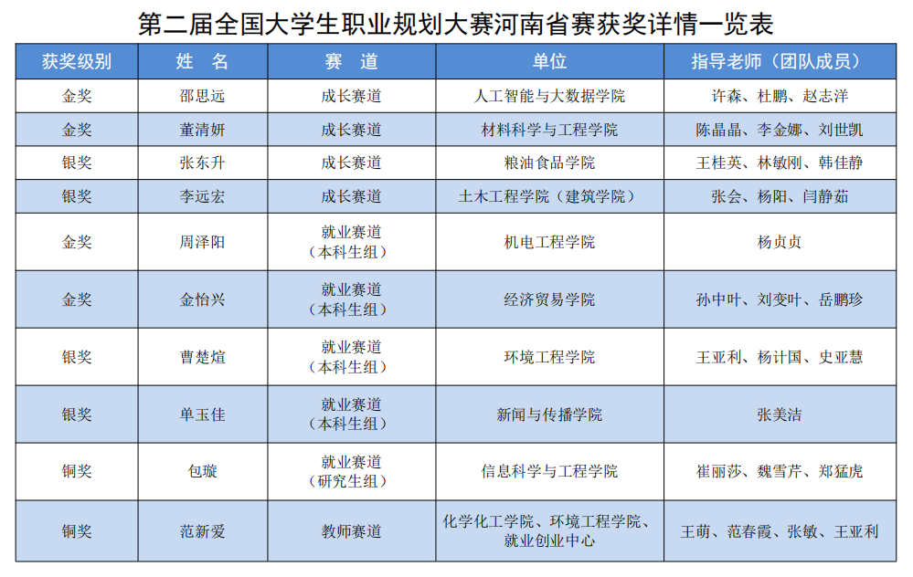 近日,第二屆全國大學(xué)生職業(yè)規(guī)劃大賽河南省賽落下帷幕。我校師生憑借扎實的專業(yè)素養(yǎng)、清晰的職業(yè)規(guī)劃和出色的臨場表現(xiàn),在賽場上脫穎而出,斬獲4金4銀2銅的優(yōu)異成績,金獎和銀獎獲獎數(shù)量位居全省高校第二位,再創(chuàng)我校省賽歷史最好成績。
