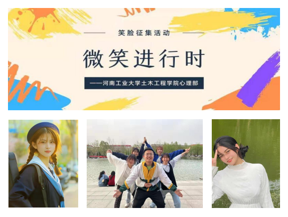 4月26日,土木工程學院心理部通過線上征集、線上投票、線上展示的方式收集同學們的笑臉。讓微笑的力量傳遞校園,讓生命永遠都有笑的陪伴,讓生活充滿陽光與活力。通過此次活動給同學們分享并傳遞快樂,讓笑聲洋溢校園, 培養同學們積極樂觀的心態,營造活潑、健康向上的文化氛圍,傳遞正能量。