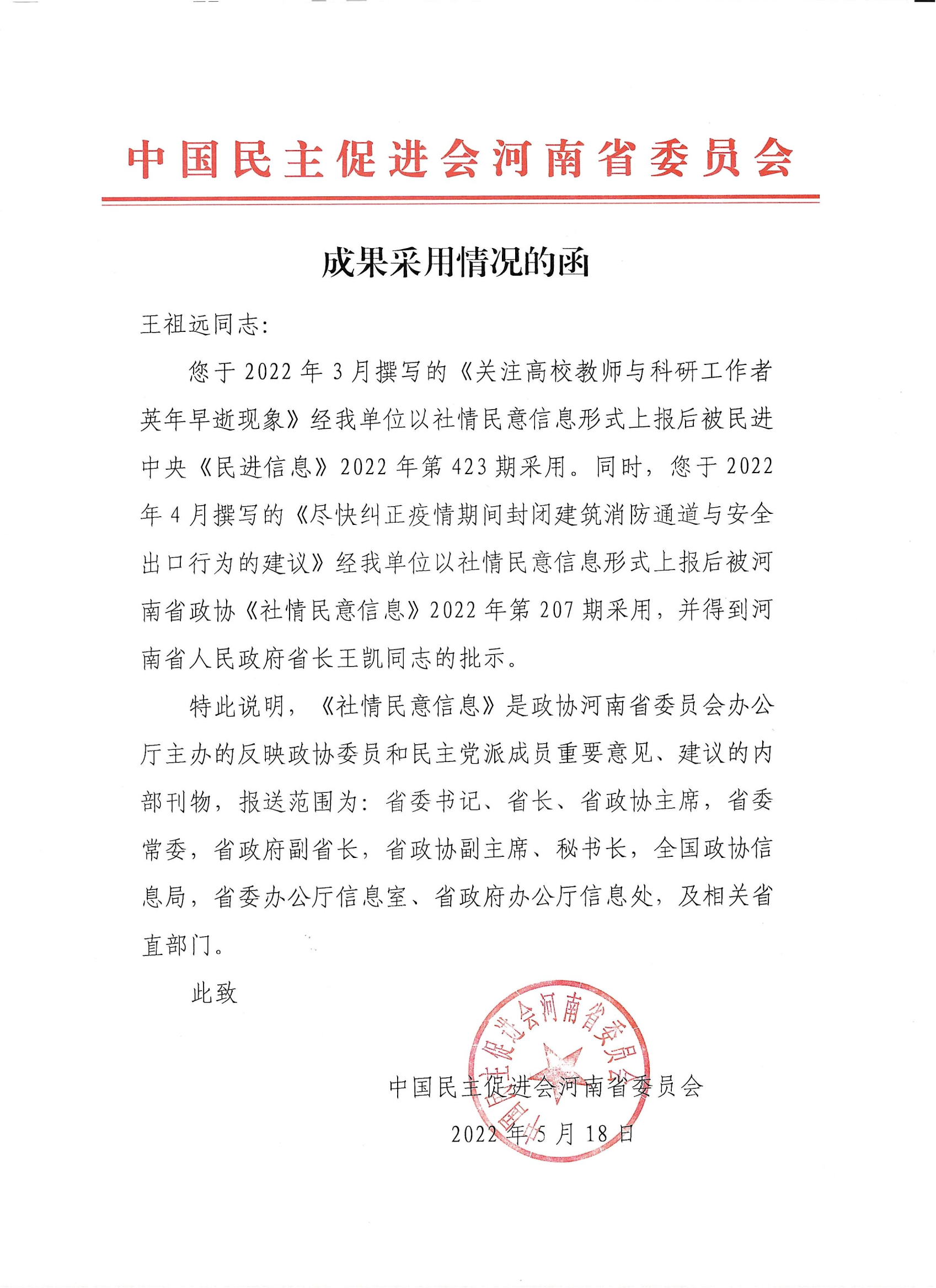 近日,民進河南工業大學支部副主委、土木工程(建筑)學院副教授王祖遠撰寫的《關于盡快糾正疫情期間違法封閉建筑消防通道與安全出口的建議》,經民進河南省委會以社情民意信息形式上報后被省政協《社情民意信息》采用,并得到河南省人民政府省長王凱同志批示。