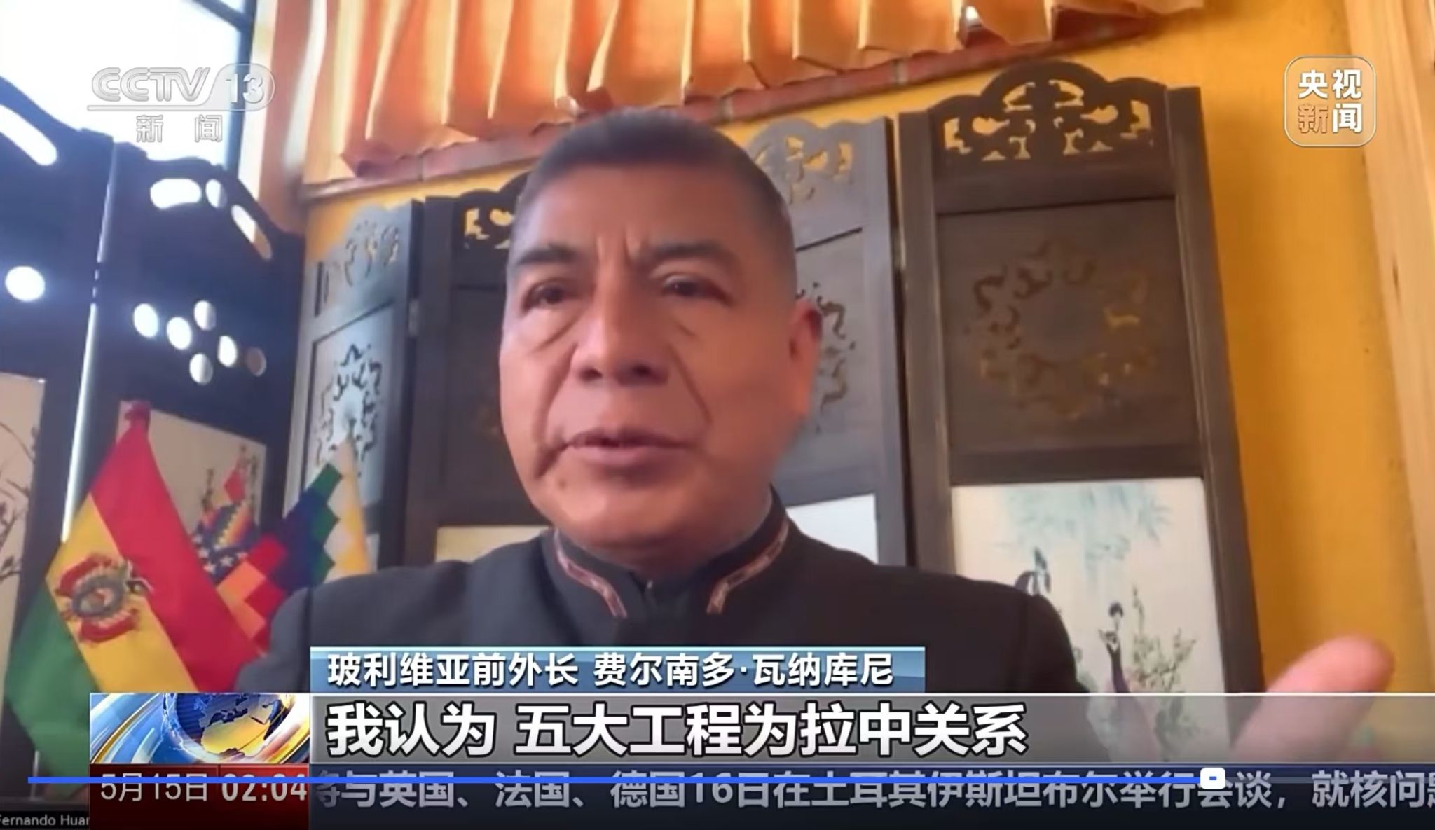 5月15日,河南工業大學援外培訓優秀學員、玻利維亞前外交部長費爾南多·瓦納庫尼·馬馬尼接受央視新聞采訪,瓦納庫尼在接受采訪時表示:“‘五大工程’為拉中關系開辟新的發展空間帶來巨大的增長預期,我們的合作是建立在友誼基礎上的合作模式。”