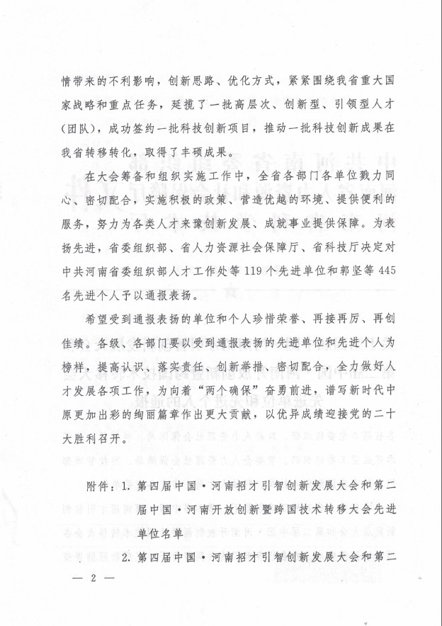 繽紛初夏、五月花開。近日,中共河南省委組織部、河南省人力資源和社會保障廳、河南省科學技術廳聯合發文,對在第四屆中國·河南招才引智創新大會和第二屆中國·河南開放創新暨跨國技術轉移大會中工作突出的先進單位進行了通報,河南工業大學因招才引智成效突出榮獲“先進單位”。