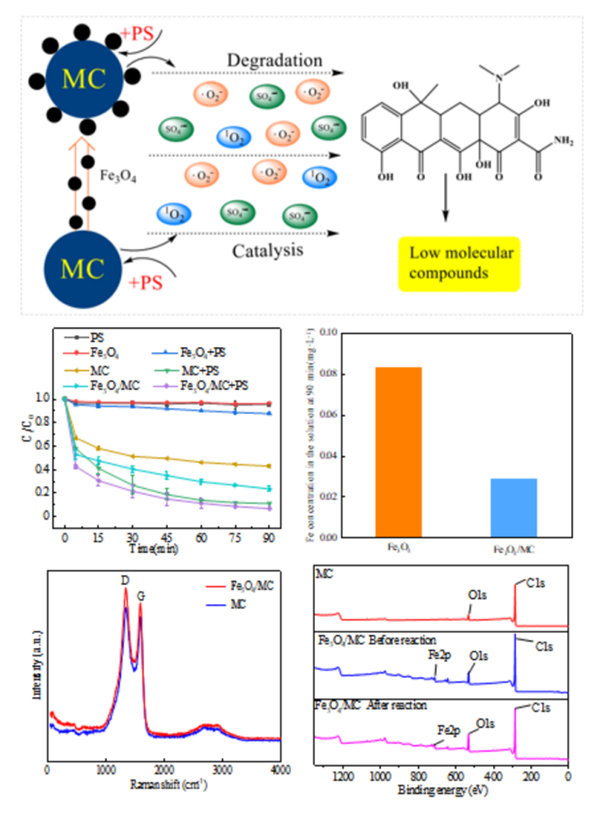鹽酸四環(huán)素(TC)作為一種典型的廣譜抗生素,已大量應(yīng)用于抑制人類及動物的細菌感染過程。近年來,抗生素在環(huán)境水體中的大量存在已成為人們關(guān)注的焦點,抗生素污染對生態(tài)環(huán)境和人體健康產(chǎn)生了嚴重的危害。本研究制備了一種新型磁性介孔碳復(fù)合材料(Fe3O4/MC),并將其活化過硫酸鹽產(chǎn)生活性氧化物種(ROS)降解水中的鹽酸四環(huán)素。碳酸錳為活化劑制備的介孔碳具有較大的比表面積,其表面的含氧官能團能作為電子轉(zhuǎn)移的催化活化點位,這使得介孔碳自身對過硫酸鹽具有較強的活化能力。此外,拉曼光譜表明介孔碳及復(fù)合材料表面的結(jié)構(gòu)缺陷更加有利于ROS的生成。Fe3O4/MC與過硫酸鹽反應(yīng)體系活化氧化物種主要包括?O2-、SO4?-、1O2和?OH。本研究為新型環(huán)境材料降解水中的抗生素提供了理論基礎(chǔ)和依據(jù)。