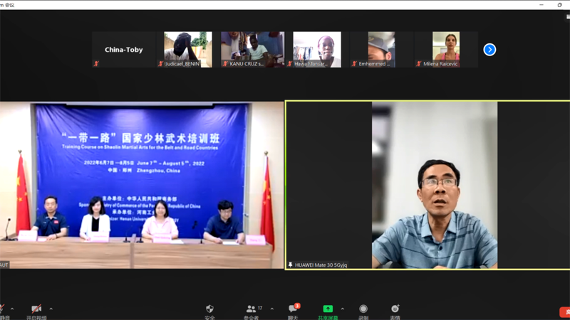 楊軍岐代表河南省商務廳外經處致辭。他指出,近年來,河南省著眼文明交流互鑒,積極推進中華武術“走向世界”,尤其是2019年以來,河南省援外培訓中心聚合河南工業大學辦學優勢,充分發揮少林和太極兩張武術名片優勢,成功在格林納達、拉脫維亞、波黑等地舉辦多期線上武術培訓活動,培訓成效獲得新華社海外網、人民日報海外網、學習強國以及受援國家媒體、平臺報道宣傳,境外培訓的成功舉辦在海外引起很大反響,受到駐國外使領館的高度評價。