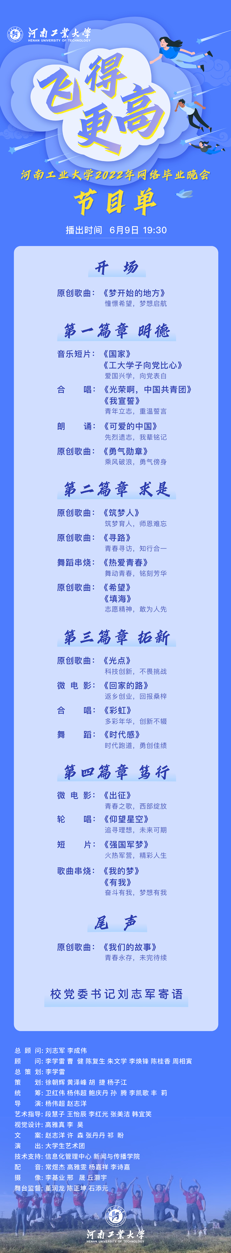 學(xué)校黨委高度重視今年的網(wǎng)絡(luò)畢業(yè)晚會。校黨委劉志軍書記為晚會錄制寄語,李學(xué)雷副書記帶領(lǐng)有關(guān)部門同志兩次審核晚會內(nèi)容,確保晚會完美呈現(xiàn)。今年,是我校三年來第二次以網(wǎng)絡(luò)畢業(yè)晚會的形式送別畢業(yè)生,該晚會由校團(tuán)委主辦,大學(xué)生藝術(shù)團(tuán)、大學(xué)生廣播站出演,黨委宣傳部、學(xué)生工作部、校工會、招生工作辦公室、信息化管理中心、社會合作與校友辦公室、新聞與傳播學(xué)院、設(shè)計藝術(shù)學(xué)院、體育學(xué)院等共同參與創(chuàng)作。