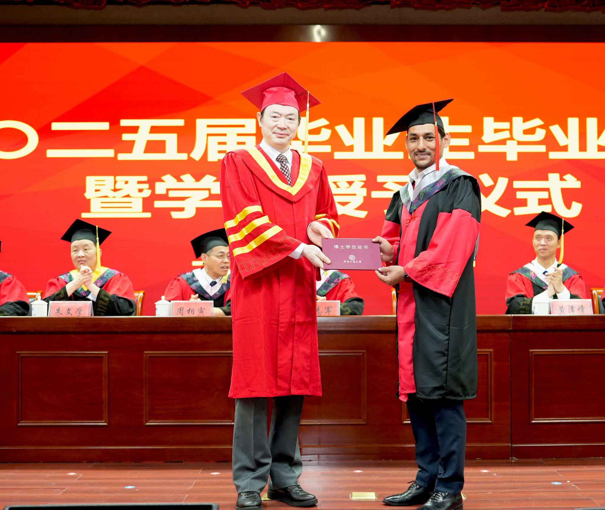 在莊嚴的學位授予儀式,吳智深為獲得博士學位的17位博士畢業生授發學位證書并依次合影留念;全體校領導分別為獲得碩士學位、榮譽學士學位、學士學位的學生代表授發學位證書并撥穗正冠,為榮獲2025年優秀應屆畢業生榮譽和國家學生體質健康標準優秀等級的學生頒發證書并合影留念。