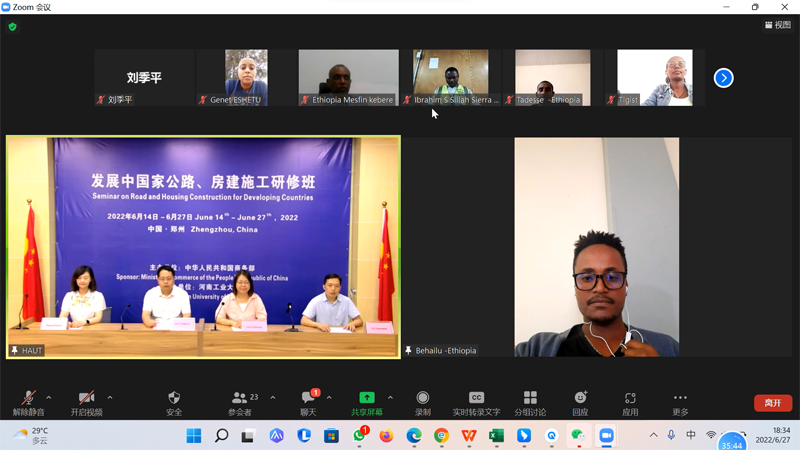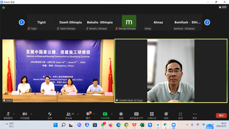 來(lái)自埃塞俄比亞的貝海路先生代表全體學(xué)員發(fā)言。他代表全體學(xué)員感謝中國(guó)政府提供的學(xué)習(xí)機(jī)會(huì),感謝河南工業(yè)大學(xué)專(zhuān)家教授們無(wú)私分享中國(guó)在公路、房屋建筑方面取得的寶貴經(jīng)驗(yàn)。他指出,通過(guò)研修班,大家學(xué)習(xí)到了中國(guó)在公路、房屋建筑等方面的寶貴經(jīng)驗(yàn),也同其他國(guó)家的學(xué)員就公路和房建等問(wèn)題進(jìn)行了充分的探討交流;希望在全球疫情得到有效控制后,學(xué)員們能有機(jī)會(huì)親身到中國(guó)河南工業(yè)大學(xué)學(xué)習(xí)交流。