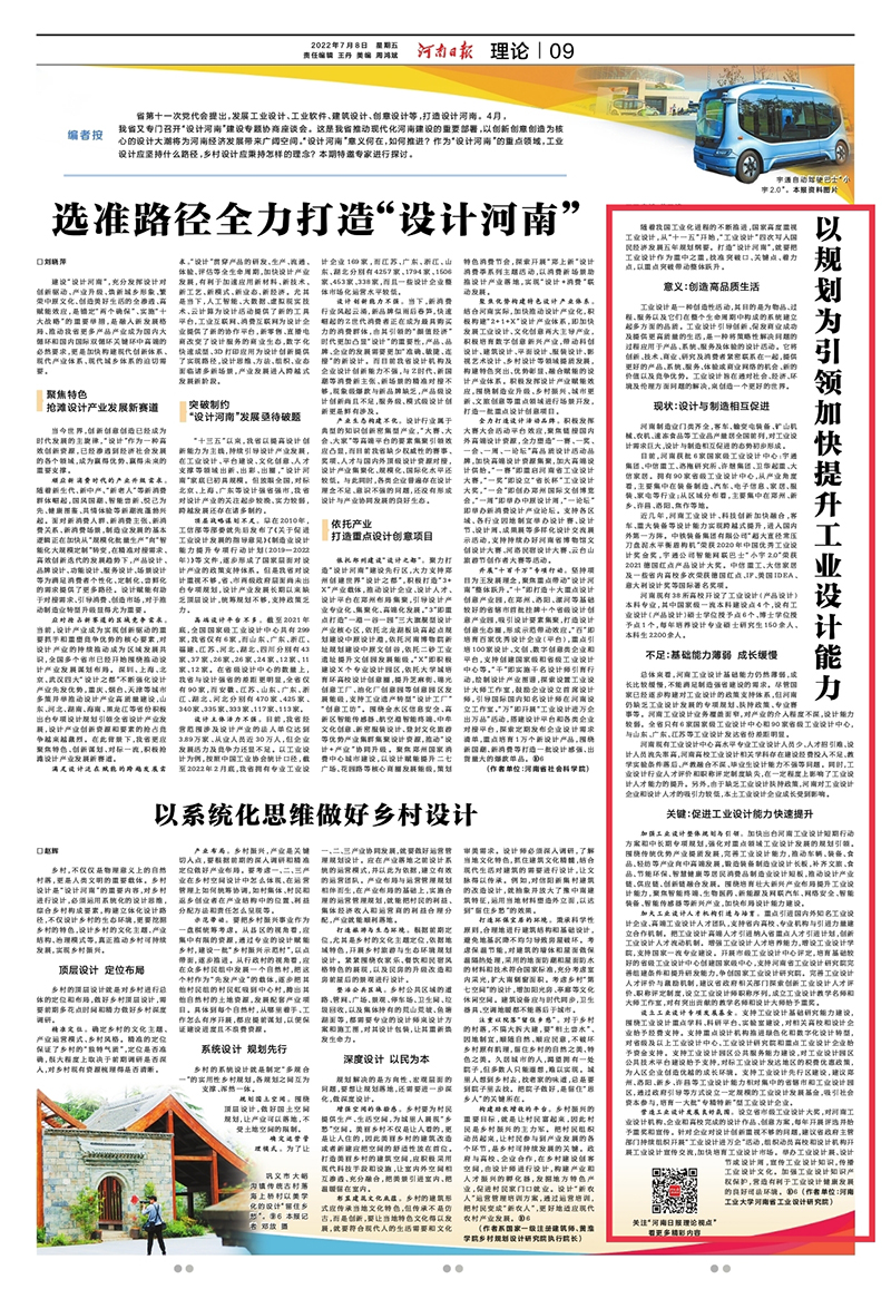 7月8日,《河南日報》理論版刊發(fā)我校設(shè)計藝術(shù)學(xué)院、河南省工業(yè)設(shè)計研究院院長王慶斌教授、河南省工業(yè)設(shè)計研究院綜合辦主任佗衛(wèi)濤老師合著文章。文章以《以規(guī)劃為引領(lǐng)加快提升工業(yè)設(shè)計能力》為題,探討分析了在“設(shè)計河南”背景下,河南省做好工業(yè)設(shè)計的意義,河南省工業(yè)設(shè)計的現(xiàn)狀和不足,提出做好“設(shè)計河南”的關(guān)鍵在于促進工業(yè)設(shè)計能力快速提升。