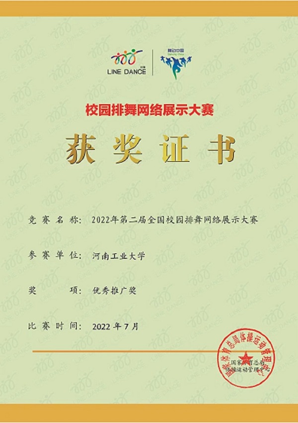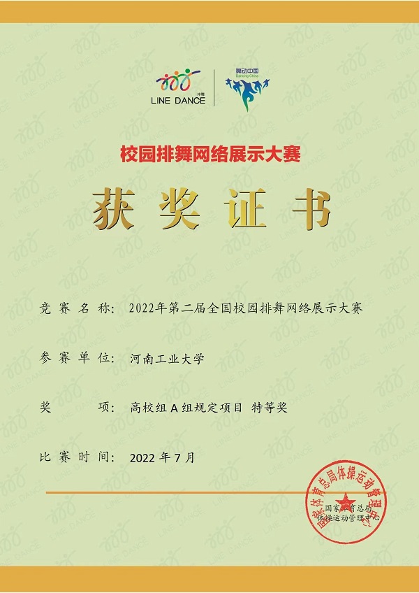 近日,由國家體育總局體操運動管理中心主辦的“2022年第二屆全國校園排舞網絡展示大賽”如期舉行。本次大賽共吸引了來自浙江理工大學、太原理工大學、四川外國語大學等全國20個省共254支隊伍,近5萬余學生參與大賽。我校排舞隊共選出102名學生參加此次比賽,在高校組規定項目比賽中斬獲全國第一名的優異成績,榮獲特等獎及優秀推廣獎。
