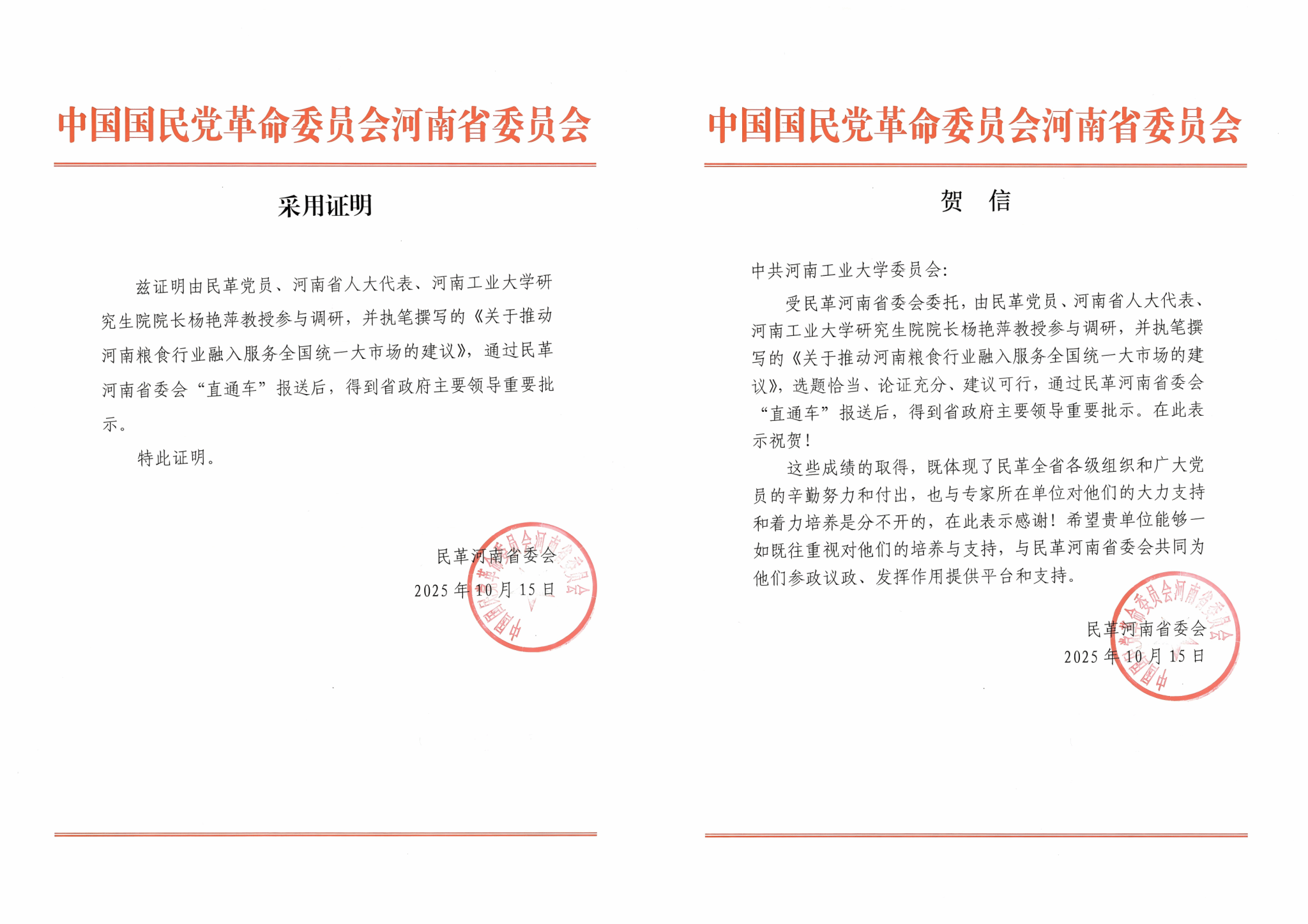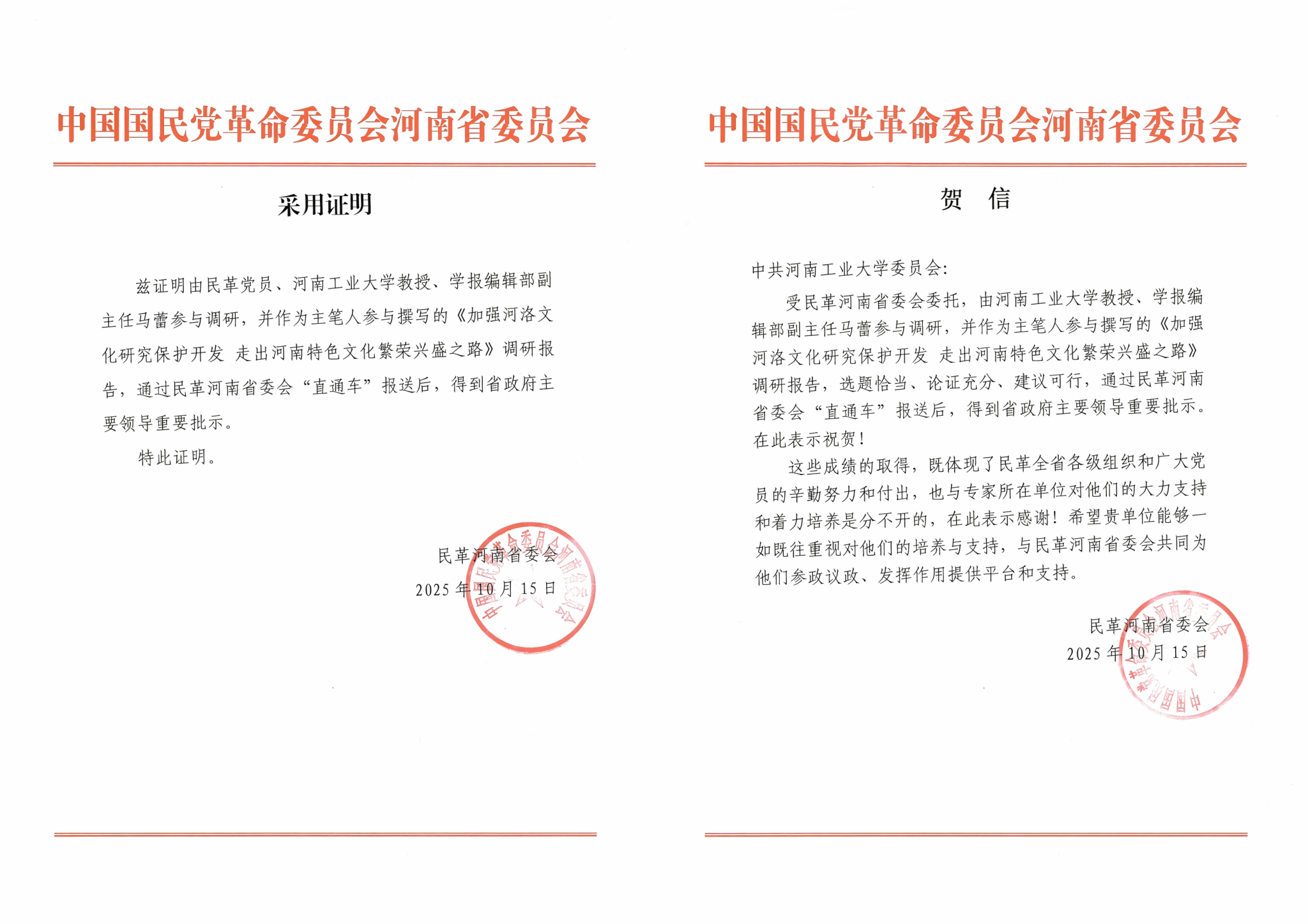 近日,民革河南省委員會發來賀信,我校兩項調研報告獲省長王凱肯定性批示。受民革河南省委委托,分別由民革省委河南工業大學委員會主委、研究生院院長楊艷萍教授執筆撰寫的《關于推動河南糧食行業融入服務全國統一大市場的建議》,民革黨員、學報編輯部副主任馬蕾教授執筆撰寫的《加強河洛文化研究保護開發 走出河南特色文化繁榮興盛之路》,選題恰當、論證充分、建議可行,通過民革河南省委會報送后,10月11日獲得省長王凱重要批示,并要求省主管職能部門在工作中加以采納,為助推我省糧食行業高質量融入服務全國統一大市場,推進文化強省建設塑造文化繁榮興盛的新標桿向興賦能。