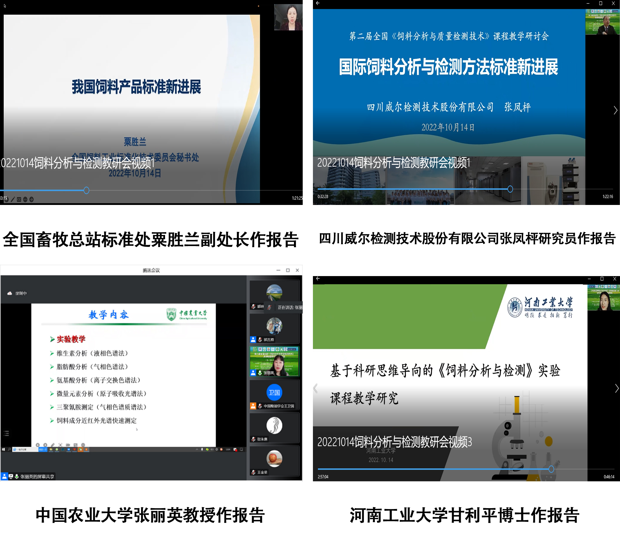 本次研討會是在2020年成功舉辦第一屆會議的基礎上召開,參會學校和人數較上屆有大幅增加。會議以“創新飼料質量檢測教學,培養新農科人才”為主題,進行了本科生、研究生的課程教學研究成果的深入交流與教學理念、目標、內容、方法改革的探討。會議第一階段安排了行業專家特邀報告,由中國糧油學會飼料分會副會長、中國農業大學張麗英教授主持。全國畜牧總站標準處粟勝蘭副處長、四川威爾檢測技術有限公司副總經理張鳳枰研究員、禾豐食品股份有限公司品控中心總經理吳振洲博士和青島蔚藍生物有限公司首席科學家郭吉原分別作了《我國飼料產品標準新進展》、《國際飼料分析與檢測方法標準新進展》、《新時代飼料集團企業質量控制體系崗位對本科生、研究生的培養要求》和《檢測新方法帶來飼料技術的新變化》的大會報告。這些特邀報告使與會的大學教師、企業參會人員開拓了視野,進一步了解了行業對飼料相關專業人才的飼料分析檢測評價能力與素質的培養要求,深感受益。
