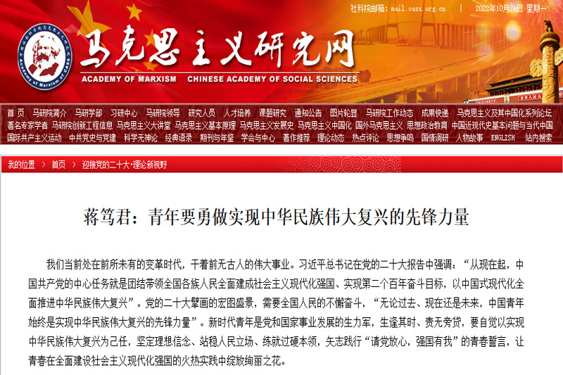 10月24日,馬克思主義研究網“迎接黨的二十大?理論新視野”專欄刊發我校馬克思主義學院蔣篤君教授學習研究宣傳闡釋黨的二十大精神的理論文章《青年要勇做實現中華民族偉大復興的先鋒力量》。